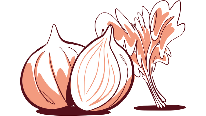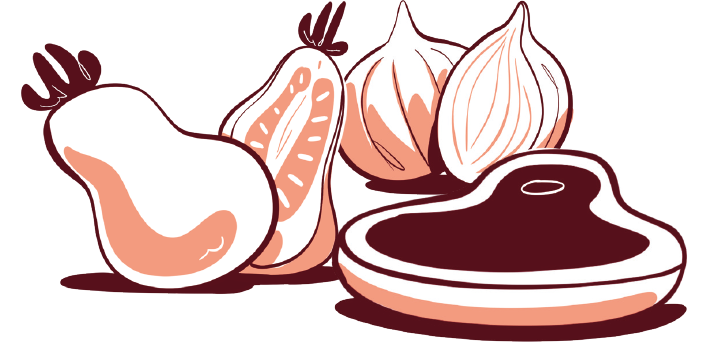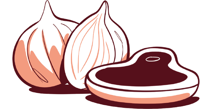 Cipolle ramate, carne bovina, carote, sedano, olio extravergine d’oliva, sale, vino rosso, alloro.